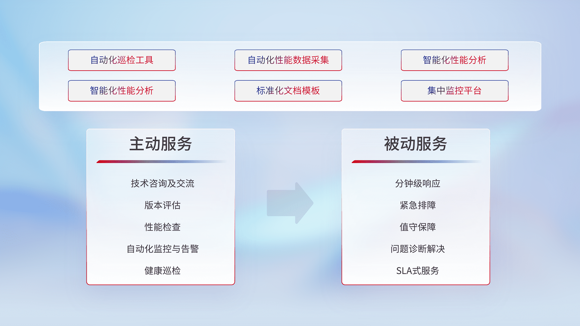 智能化工具和标准化文档,,,,保障服务质量,,提供主动服务(包含技术咨询、、、、版本评估、、性能检查、、、自动化监控与告警、、、健康巡检)和被动服务包含(分钟级响应、、、紧急排障、、值守保障、、、、问题诊断解决、、、SLA服务)。。。